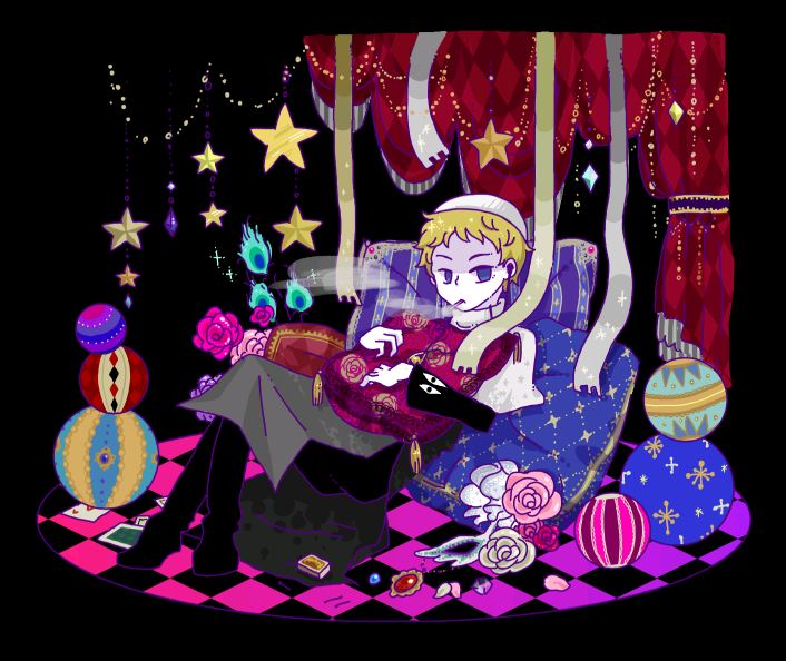 そんな心持ちでお絵かきしはじめたら派手になりました。ピエロとかキラキラしたの大好きです。